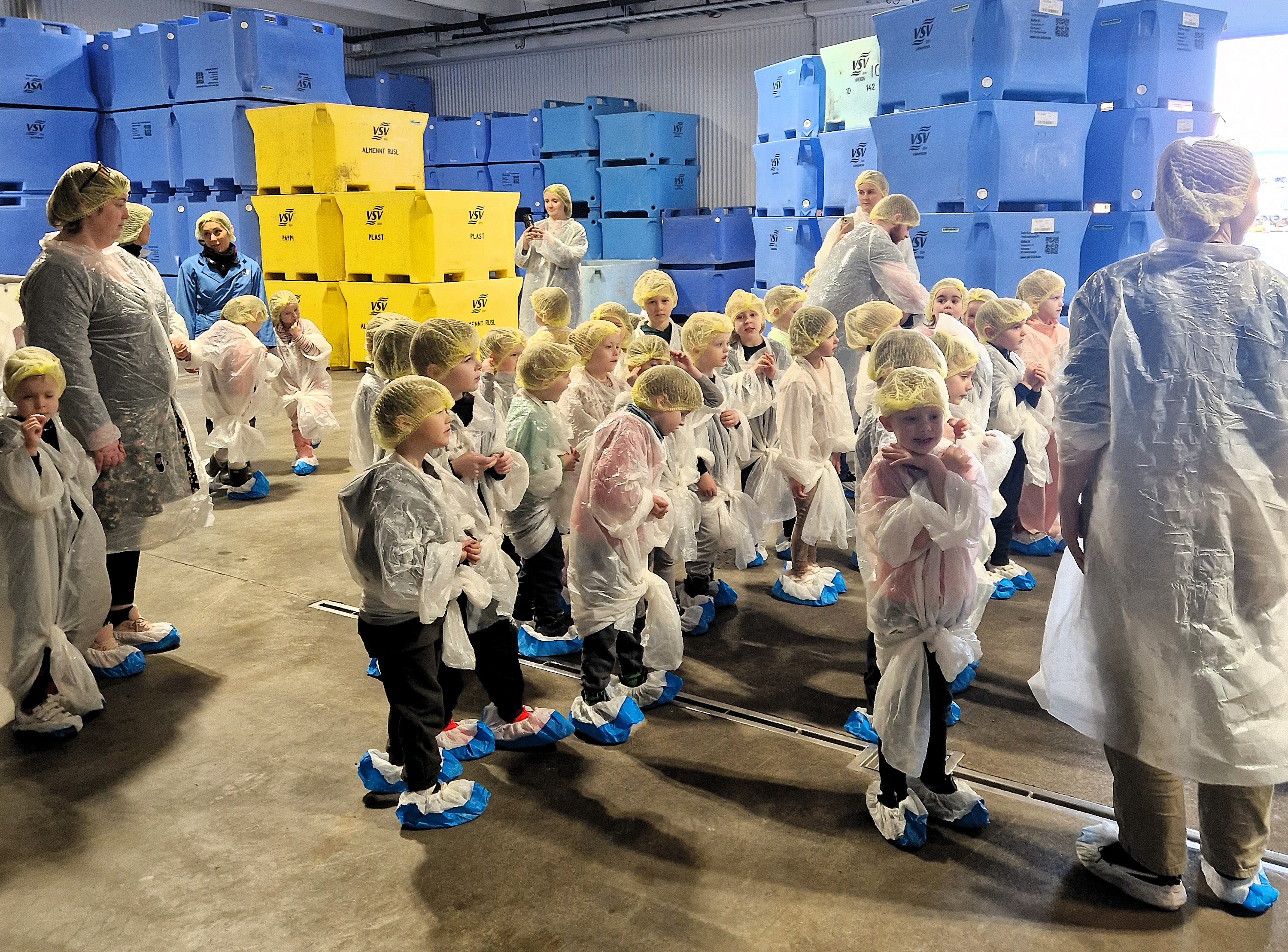 Benóný Þórisson og Helena Björk Þorsteinsdóttir tóku á móti börnunum í anddyri aðalinngangs VSV og þar klæddu þau sig í skóhlýfar, hárnet og sloppa. Það þótti þeim agalega spennandi.
