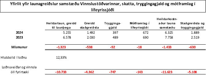 Launagreiðslur Vinnslustöðvarinnar og íslenskra dótturfélaga drógust saman um 20% á milli áranna 2024 og 2023. Heildarfjárhæð greiddra launa nam tæplega 5,3 milljörðum króna árið 2024 en voru tæplega 6,6 milljarðar króna árið 2023. Mismunur launagreiðslna er því 1,3 milljarðar króna. Stærsta, og í raun eina, skýring þessa mismunar er loðnubrestur ársins 2024. Þess ber að geta að laun starfsmanna í landi hækkuðu á síðasta ári í kjölfar kjarasamninga, sem þýðir í raun að munurinn er meiri.
